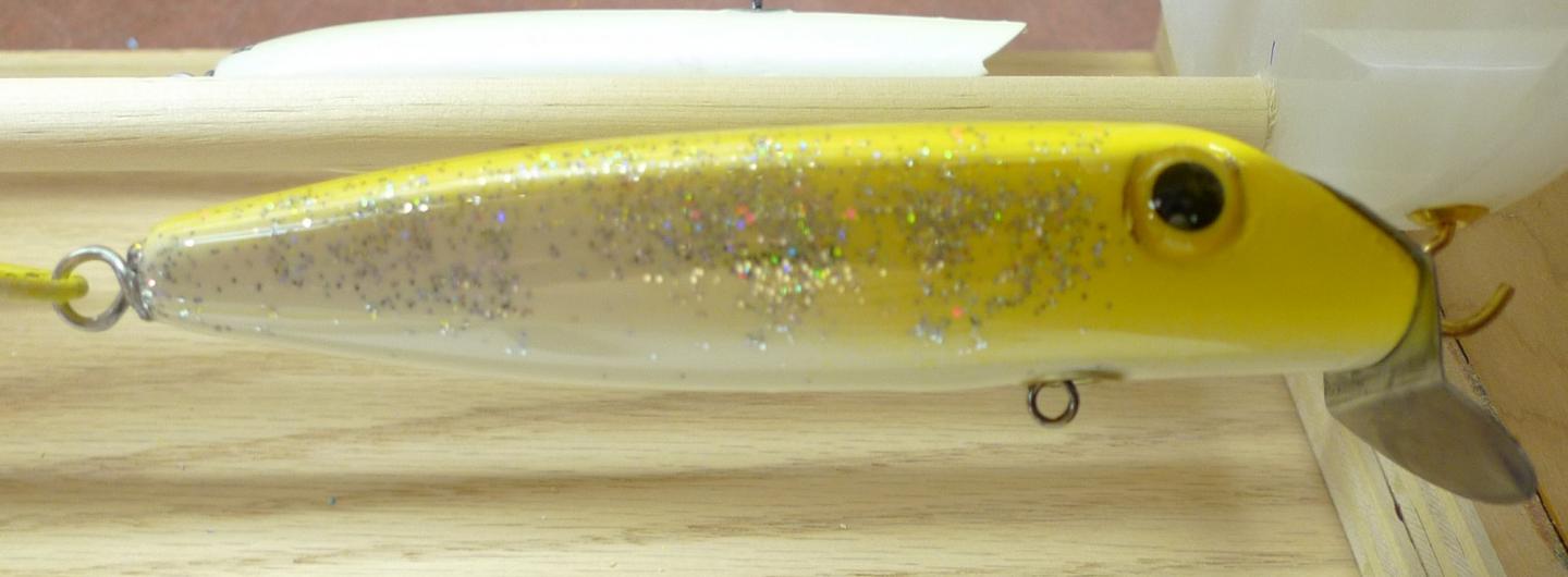 Then a yellow Rinehart Jinx Surfcaster with sparkles. Playing with the weighting to get it to swim subsurface