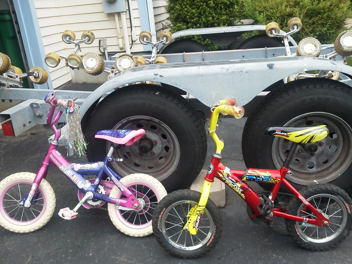 the 2 small ones - boy and girl are 12 1/2" tires. dont have the training wheels. they work fine, almost new. perfect for little kids learning or if you are working on your circus clown routine