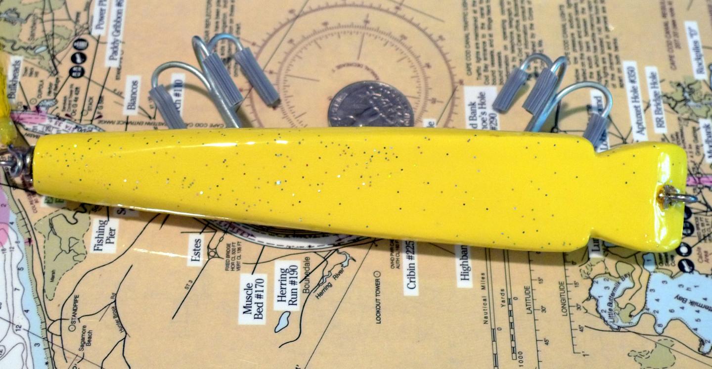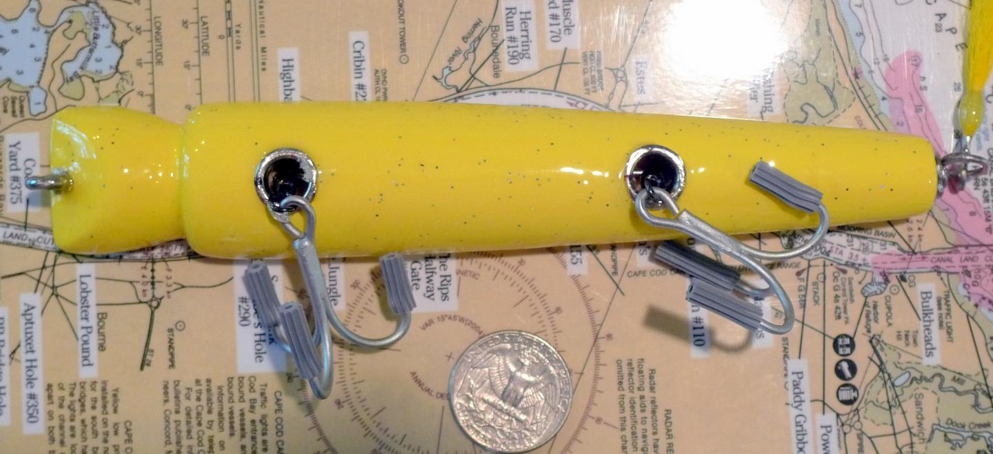 a few more pictures... fully rigged with cut VMC 3/0s and a yellow bucktail flag she weighs 2 5/8 oz