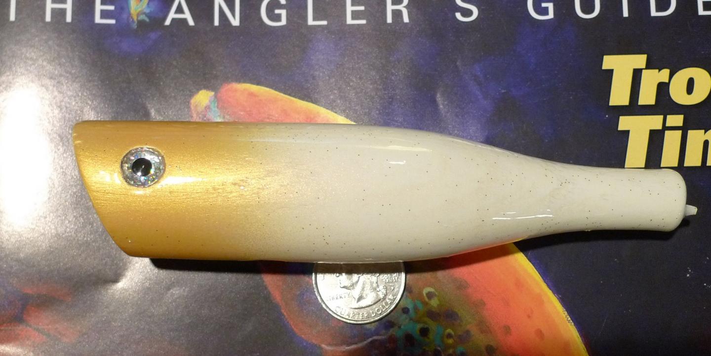Ok, here they are. Mahogany, 7", 3.5 oz, stainless steel screw eyes, 3x VMC trebles. I work them like a spook and the flaptail really causes quite a bit of commotion. I first tried it unweighted, but decided to throw in a belly weight to help the action. This was a really enjoyable build as it forced me to stray out of my comfort zone. Hopefully you all like them and ChefChris catches with it. I have an extra for the upcoming auction of course.