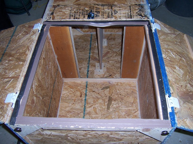internaly I have set cleats to rest the chutes on. the rear chute provides and edge above the bin.... these are set @ the 18" mark from the top... thus extending below the baffell.... the chute boards are set @60 degree angle... after installing opposing 6" take offs ( glued and screwed) I sealed the top of the box...