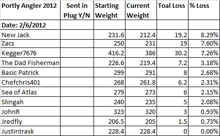 No change in standings New Jack and Kegger are doing great. Total weight loss for the Portly Angler team is 127 pounds. Lets see how quick we can get this over 200.