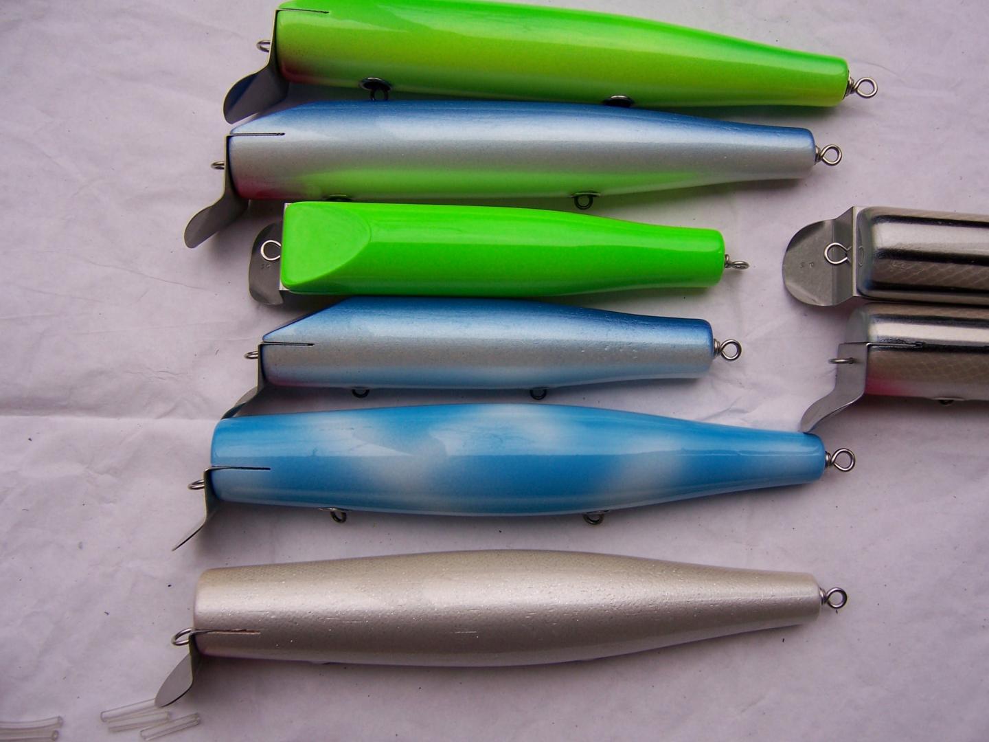These are my heavy canal poppers. Very small, maybe 5 inch and 2 1/4 oz. A normal size one I make is in upper left corner for size comparison. They cast as good as any I have thrown and pop good too. A very good producer for me last several years. The siwash no exposed tail wgt. ones are much lighter and for boat. They will pop and swim nicely.