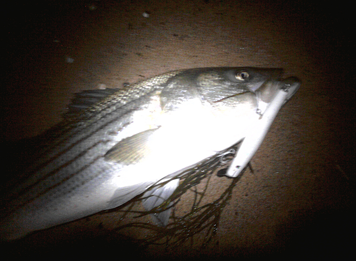 Here's a conrad fish, nothing special (maybe #15), but illustrative that you need to cover the water column top to bottom when you fish. Tough night, very calm and little sweep, nothing showing. Worked the jetty spot thoroughly with dannys (surface), darters (midwater) first without a touch. I was pretty sure it was empty, but felt compelled to try dredging the bottom. Drove a conrad down, worked along real slow, made about 10 cranks and pow. Telling that this fish must have watched the other plugs pass over it 30 times without interest, but when I put a conrad in front of its face...... bingo.