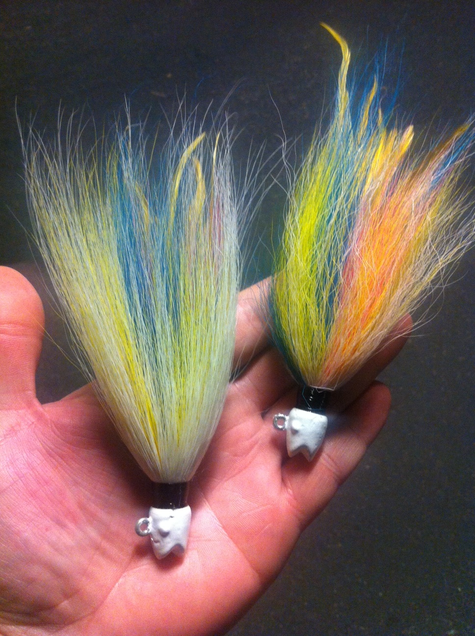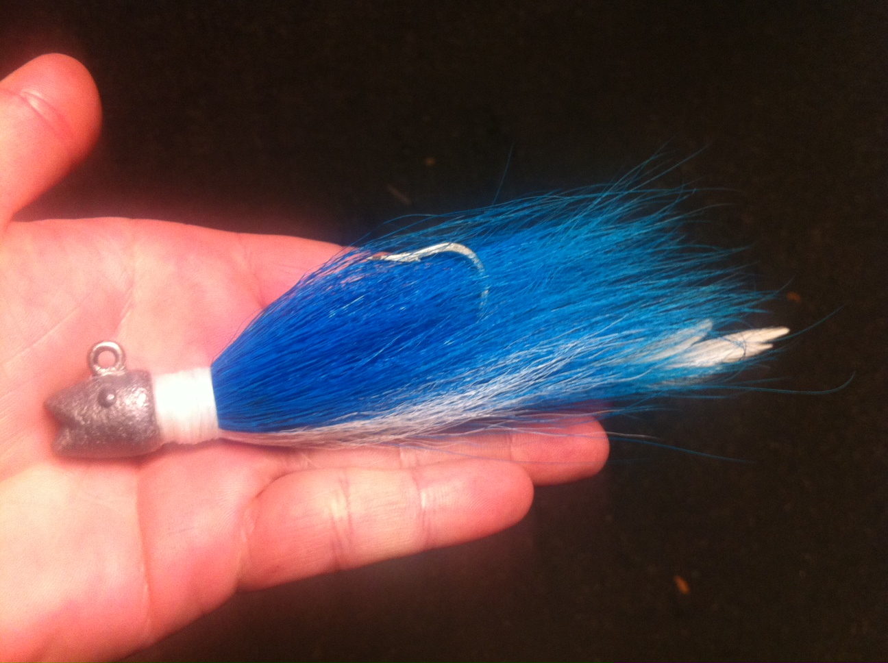 The blue/white one i tied last last fall when we had a sea herring run, the blue hair outfished all white everytime. On that jig in the pic its actually tied with white berkley braided line and super glue.