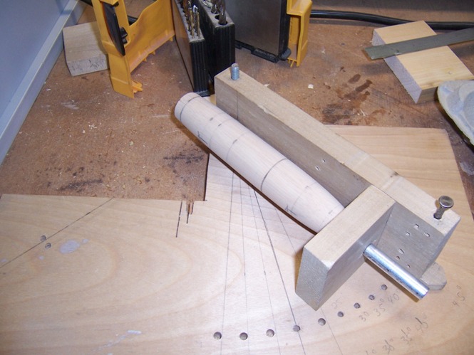 first picture is of the jig... the dowel on the belly holes fits snug.. 0 play... the tail stock pin holds it secure....