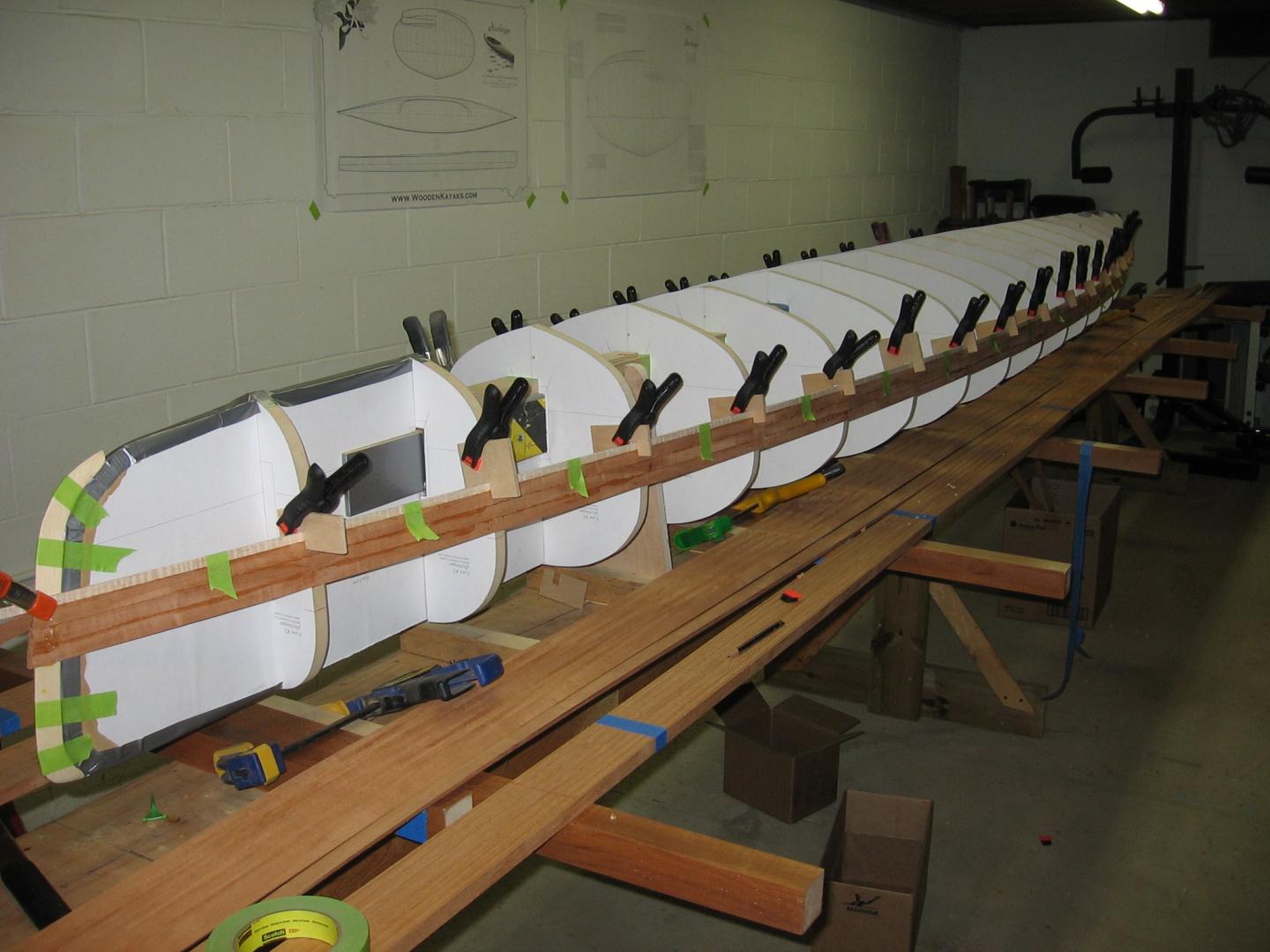Thanks guy's ,yes it is a beautiful design. Yes, it is the Microbootlegger, it weighs in at around 40 pounds, and it has made it out of the basement to apply the spar varnish for UV protection. I used a strongback that I made previously for a 17' Rangeley for a stand. The actual strongback for this project is a 2x4" square tube frame. I purchased the plans only and made the forms as well. Here are some pic's of the early stages.
