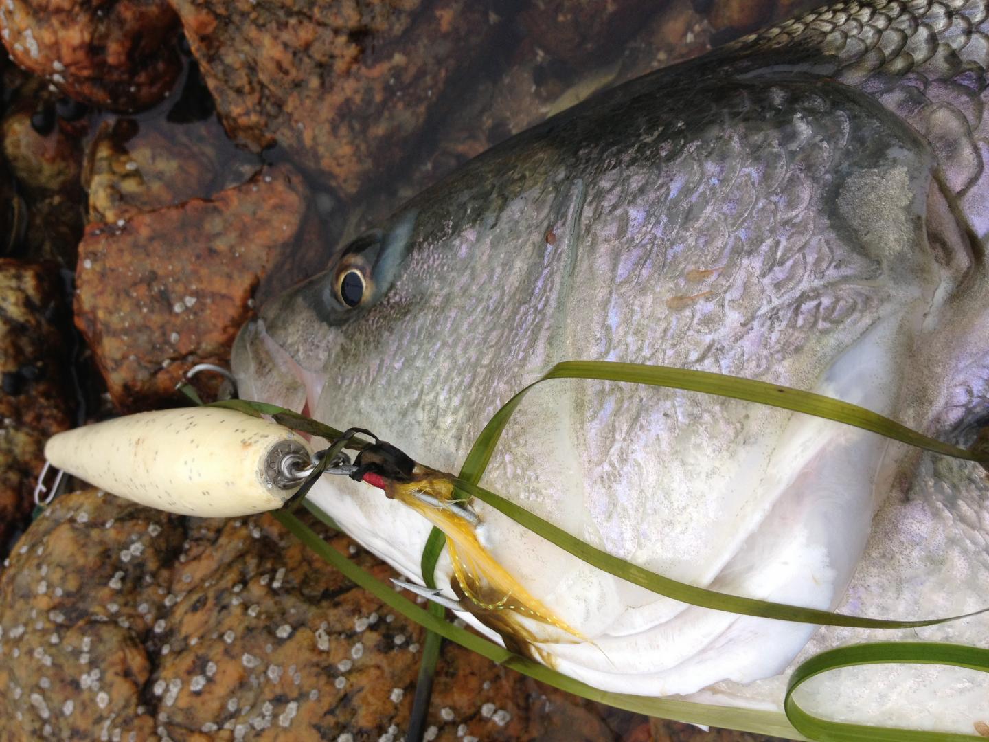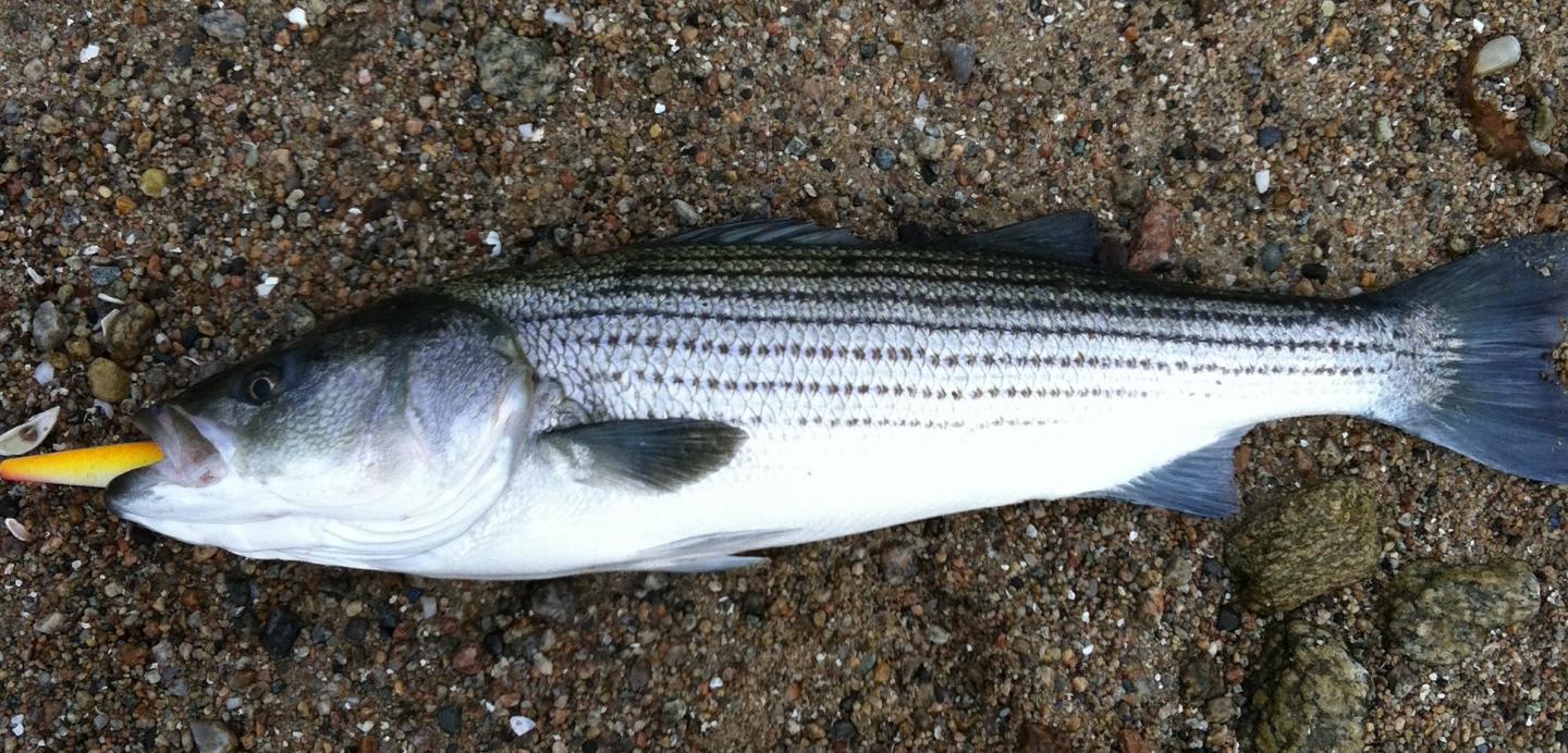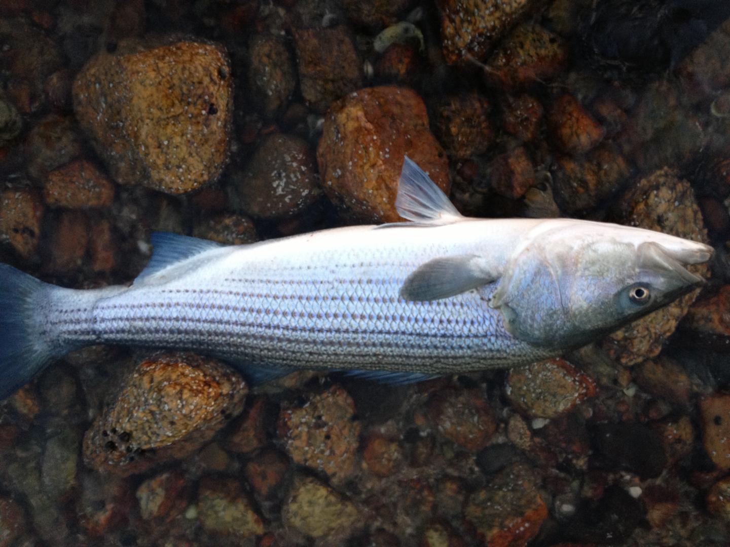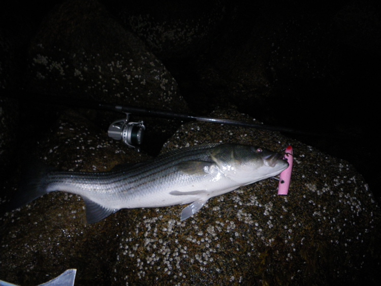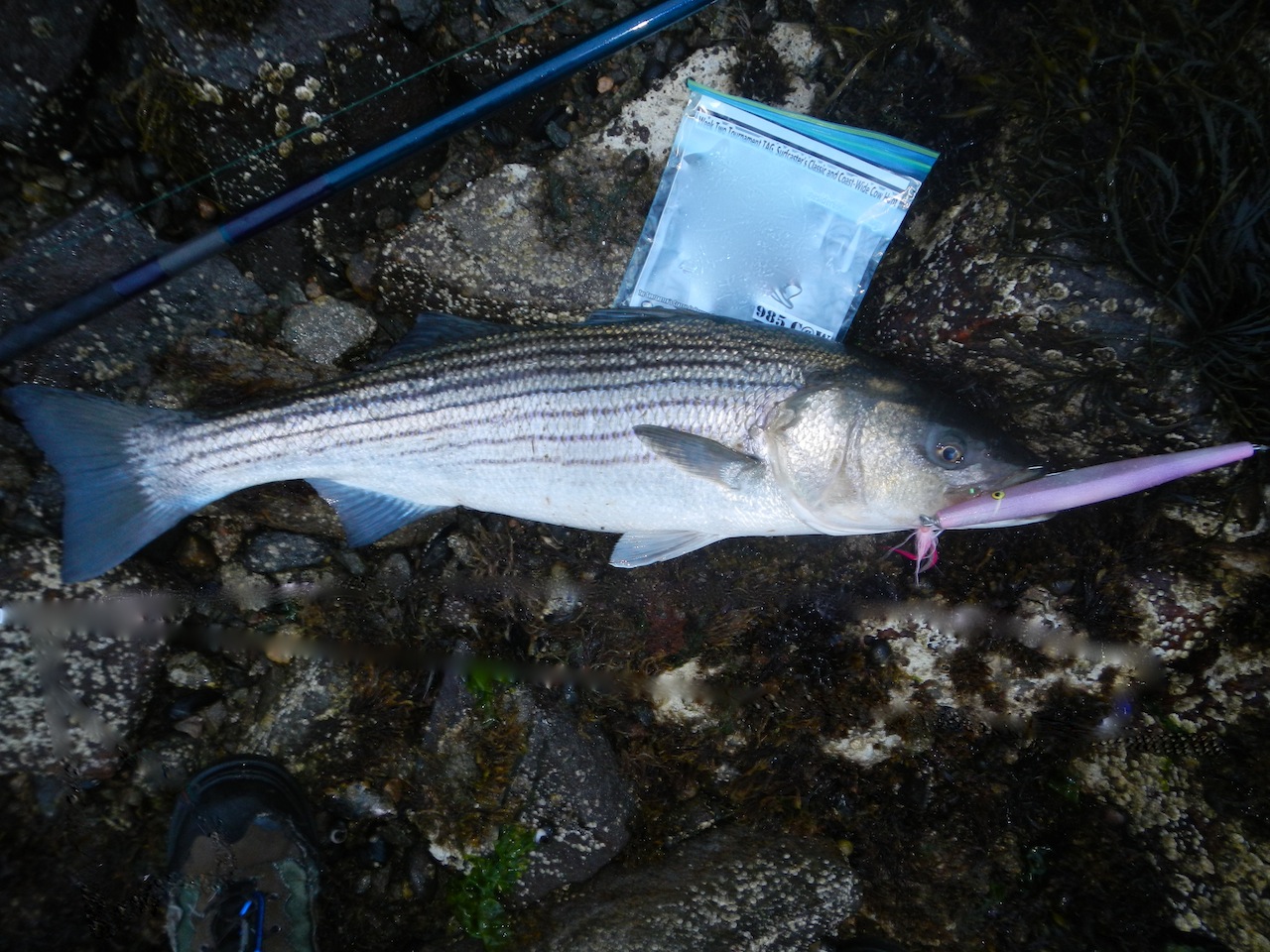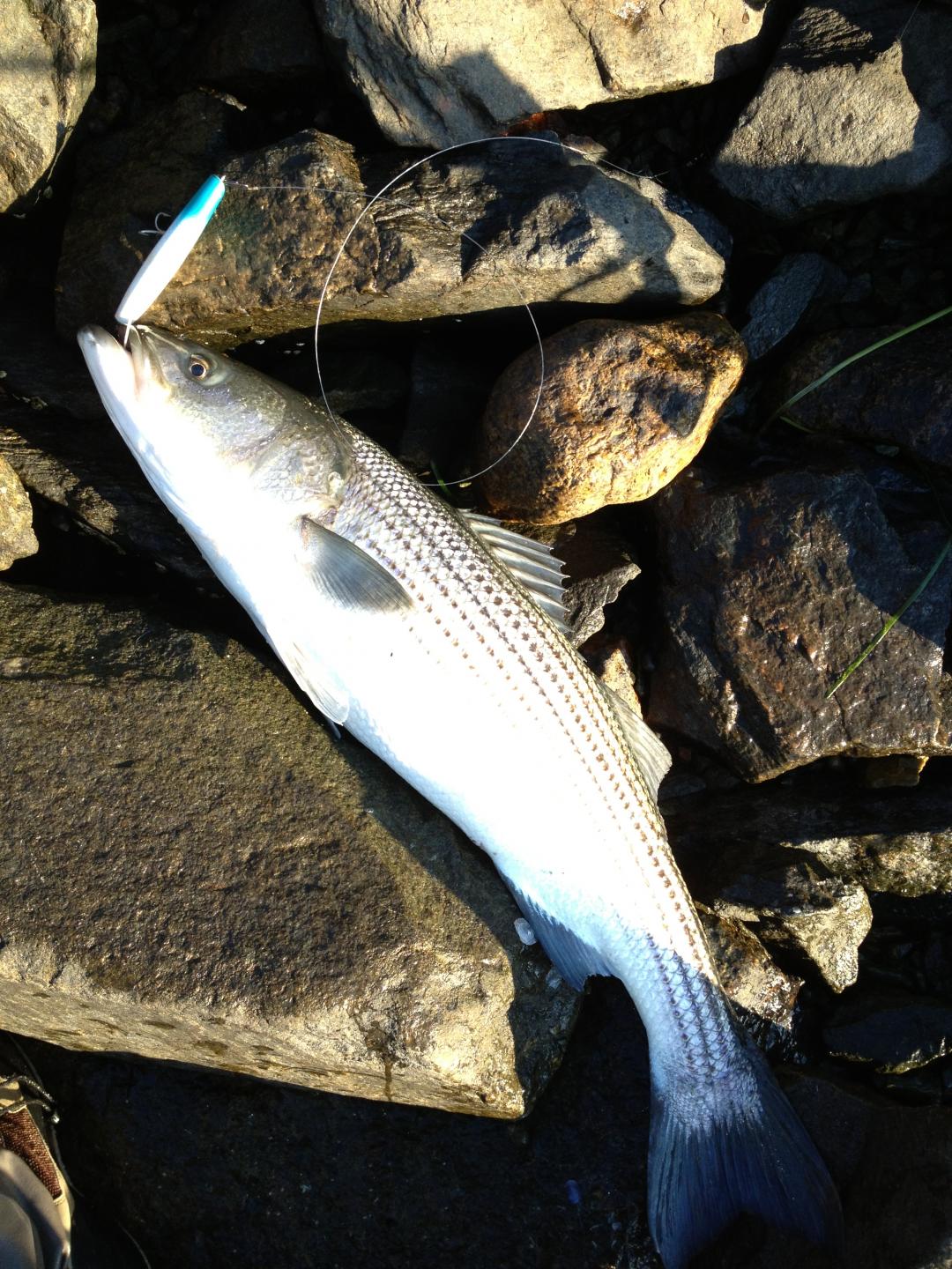 Got this low 20ish fish this morning on a 2.25oz skinny pencil in "great white" color scheme. Pic doesn't do the fish justice, but it went airborne several times during the shallow water battle and was a real pretty fish when it hit the rocks.