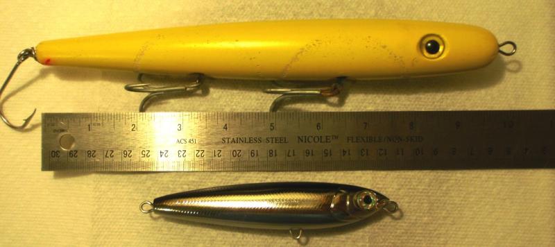 Speaking of spooks here is what I have settled on from a few years of fiddling around. For me first was the Youzui Hydro pencil,which to me is a spook , but I luv that plug and used it a lot so then I tried to make something similar thus the white thing. Worked good but kept tinkering. Then I was lucky enough to get one of Andrews plugs and really liked that, low line tie. So I tried to combine the jigman and the youzuri together. I sanded off the paint on the hydro pencil to find the weight basically in the middle of the plug. It also was pretty much where jigman put his belly weight so I settled on that location and drilled and weighted the plug perpendicular to the hooks and bottom of the plug. You can see weight hole in pic. I put lead flush from one side to other. A lot of work but I like the results. I did real well on the plug last year so that is what it will be. I much prefer it out of red cedar too. It cast's great but I am fishing it out of a boat, which to me is the optimum way to fish any spook. Standing with rod tip on the water to me gets the best action..