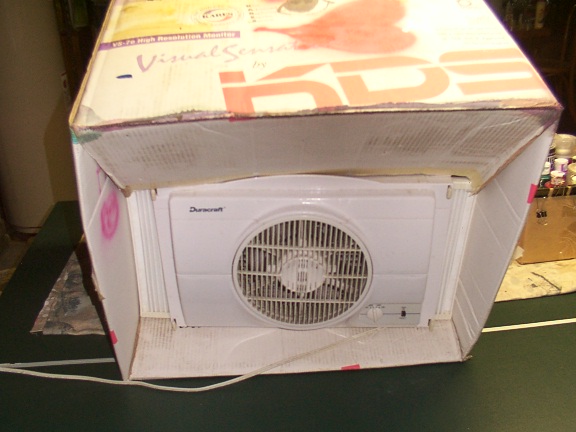 In the back to draw air is a cheap window exhaust fan that I had lying around. Once the box and batting gets caked up in paint, I toss it to the curb and slap another once together. These boxes are always lying around the office.