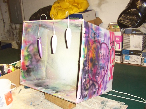 I have tried the box idea, but find that there is one hell of a lot of overspray outside the box, especially if you are hand holding the plugs for effects such as scales and blending colors. My fan was a weak one, and it didn't pull enough air to catch all the overspray. My entire shop ( office ) area was covered with acrilic dust and when I tried to clean it with simple green, it activated the colors and caused one heck of a mess to clean up.