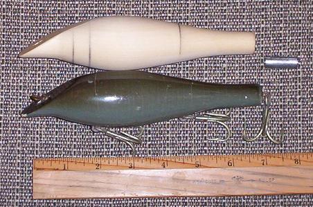 (Long distance casting deep swimming plug which is very effective with eel skin drawn over plug for night surf casting, or without eel skin for day-time casting)