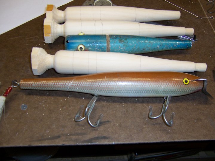 Went down the cellar this morn., surpose to be raking leaves but wife took daughter to piano lessons  , and whipped out a few. Used some beautiful old pine I have as that is what it seems they used. Second picture is the next project. Gibbs, thanks Peter. I already made a larger version of the gibbs trolling plug and now I will try this thinner one. I am kind of on a kick this year to make some larger trolling plugs. Seems to me that at least 90% or more of the plugs I see being produced by builders these days are for the casting crowd. Since I mostly boat fish and like to troll I am going to produce some plugs that I can drag behind the boat next year. I will make a conscious efffort to use these plugs and see what happens. Just don't seem to see these plugs any more, everything is plastics. I do not know anyone who fishes these large swimmers behind their boat anymore, I am sure people do but I don't know anyone. They caught many large fish in years gone by don't know why they wouldn't work nowadays. If anyone knows of any other larger trolling plugs to try I am interested. Paul