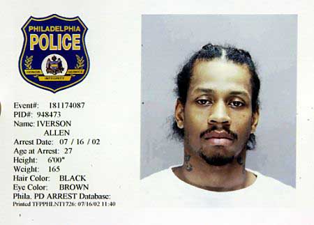 2002 - Philadelphia 76ers star Allen Iverson surrendered to police July 16, 2002 to face criminal charges that include four felonies for allegedly threatening two people with a gun. Iverson, who led the NBA in scoring last season, would plead not guilty to criminal trespass, simple assault, weapons violations and other charges at an arraignment, his attorney told reporters. (Philadelphia Police via Reuters)