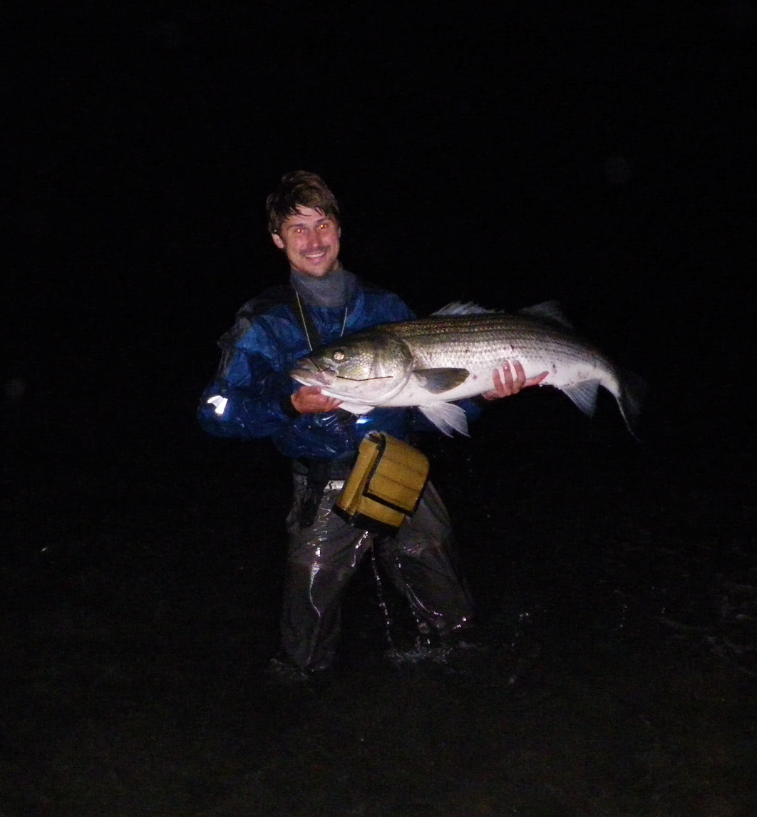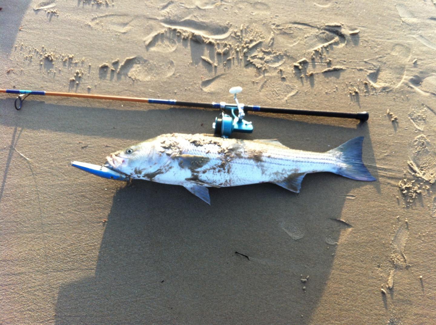 And my PB from the surf on the First pencil I built at Biteme's place. For reference the set of wraps past the reel seat is taped out at 34"  . It was the first bass I had ever caught on a pencil as well.