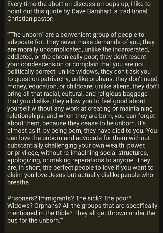 And "prisoners, immigrants, the sick, the poor, widows, orphans, all get thrown under the bus for the unborn"--really? I've not seen this phenomenon. Whenever a woman gets pregnant all those groups are thrown under a bus? Wait . . . I thought this traditional pastor said the unborn "never make demands of you."