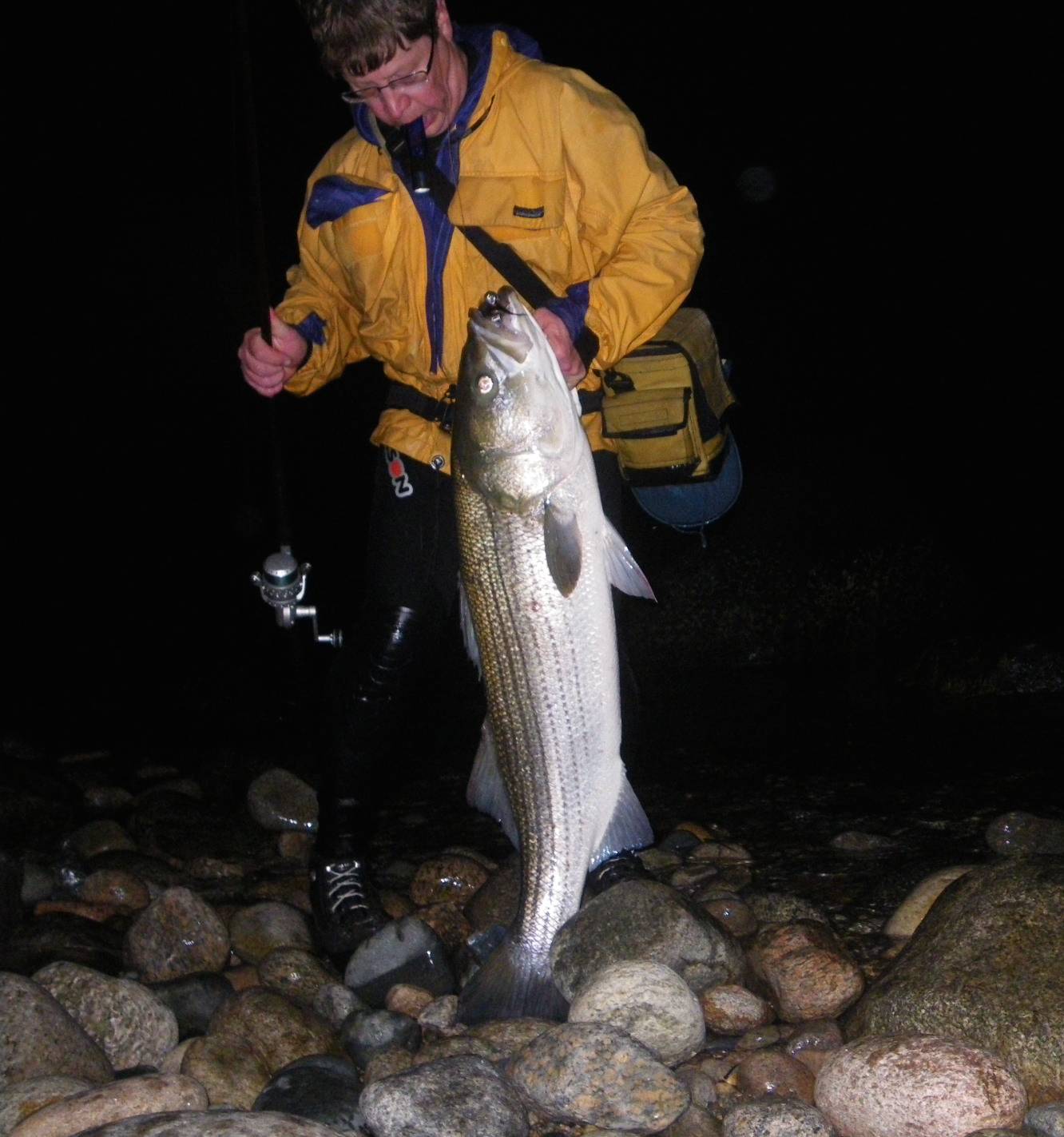 Here is a 46.5 inch 26.5 girth striper caught on one of my dad's Stubby Needlefish (in black he built from Dave Anderson's Fisherman Magazine article years ago). First cast on it after 15 on a white magic swimmer (all shorts). I will never again say a full moon is too bright. Visited my dad at Bourne National Cemetery this week. Thought it only fitting to use one of his lures. Nice that he and I are in the same neighborhood. After the photo op she swam away fresh.