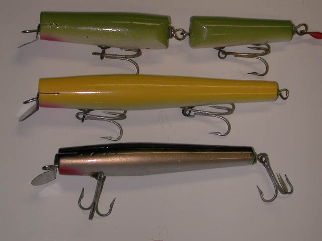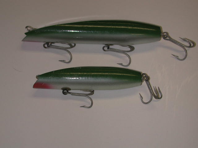 Hey Flap, here's some more Beachmaster green and silver for ya. I think the top one is rare. It is made of unweighted pine, not maple. Weighs 2 oz as opposed to the usual three. Swims nearer the surface. I'm not sure if it was a manufacturing mistake, or whether he actually had a line of pine darters for special order.