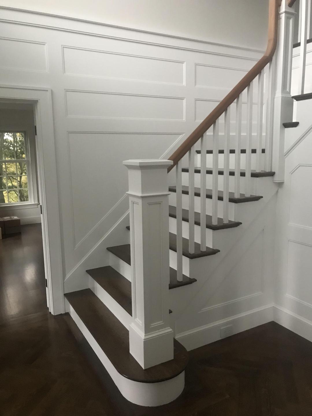 Thanks, no those maple newels and the one narrow one upstairs(not in the shot) were bought by the homeowner, I don't like the radius on the raised panel look to them, done with router obviously and looks good to them but cheap to me. and yes those shoes will be brought up, he was still polyurethaning.