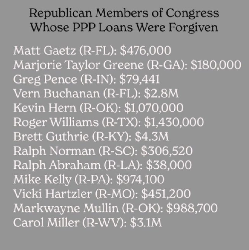 Over 10 millions businesses received these PPP loans with an average of $72,500 per loan. All—ALL— of these amounts have now been forgiven. If my math is correct, this totals over $740 million forgiven.