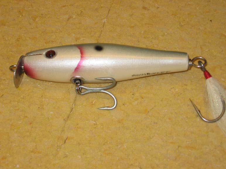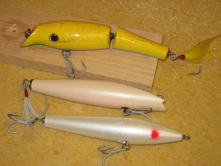 on the right is from top, a pikie I made a bunch of, a RM Smith danny that the bass wouldn't leave alone, then a spook modeled after a jigman spookk in that olivy color, a pearl white pikie I made, then a junior from Mike Thomas at M&D's