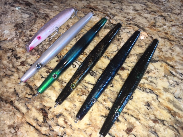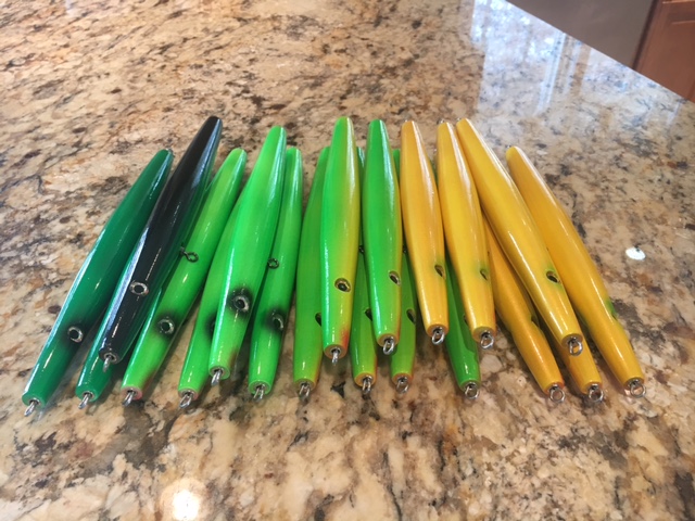 Did some surface slims 3.25oz , medium slims 4oz and 4.5oz surface fattys and a few of each size in squid 🐙 versions.