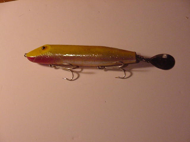 Fishingfreak, as requested. I made this Flaptail in 90' or so. Stan Daggett of West Dennis was in Riverview Bait and Tackle as I was test swimming it in Lee's large shiner tank and was the only one who knew what I had made. Right then and there Stan invited me over to his house to see all his old plugs. Awesome stuff! He gave me some needles he made to be fished with Eelskins over them. ( I will post pic).