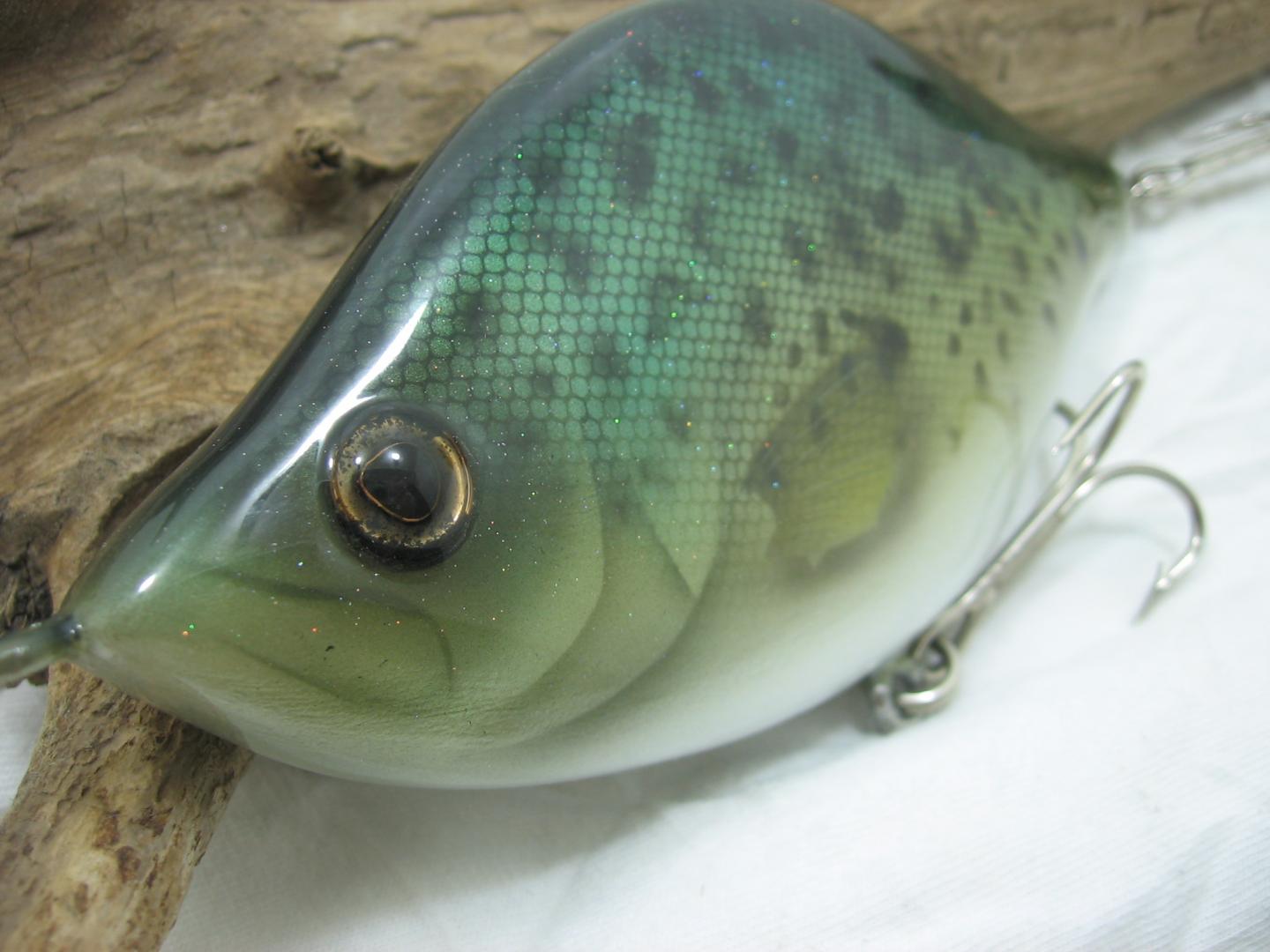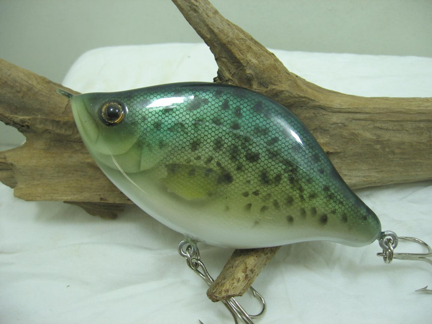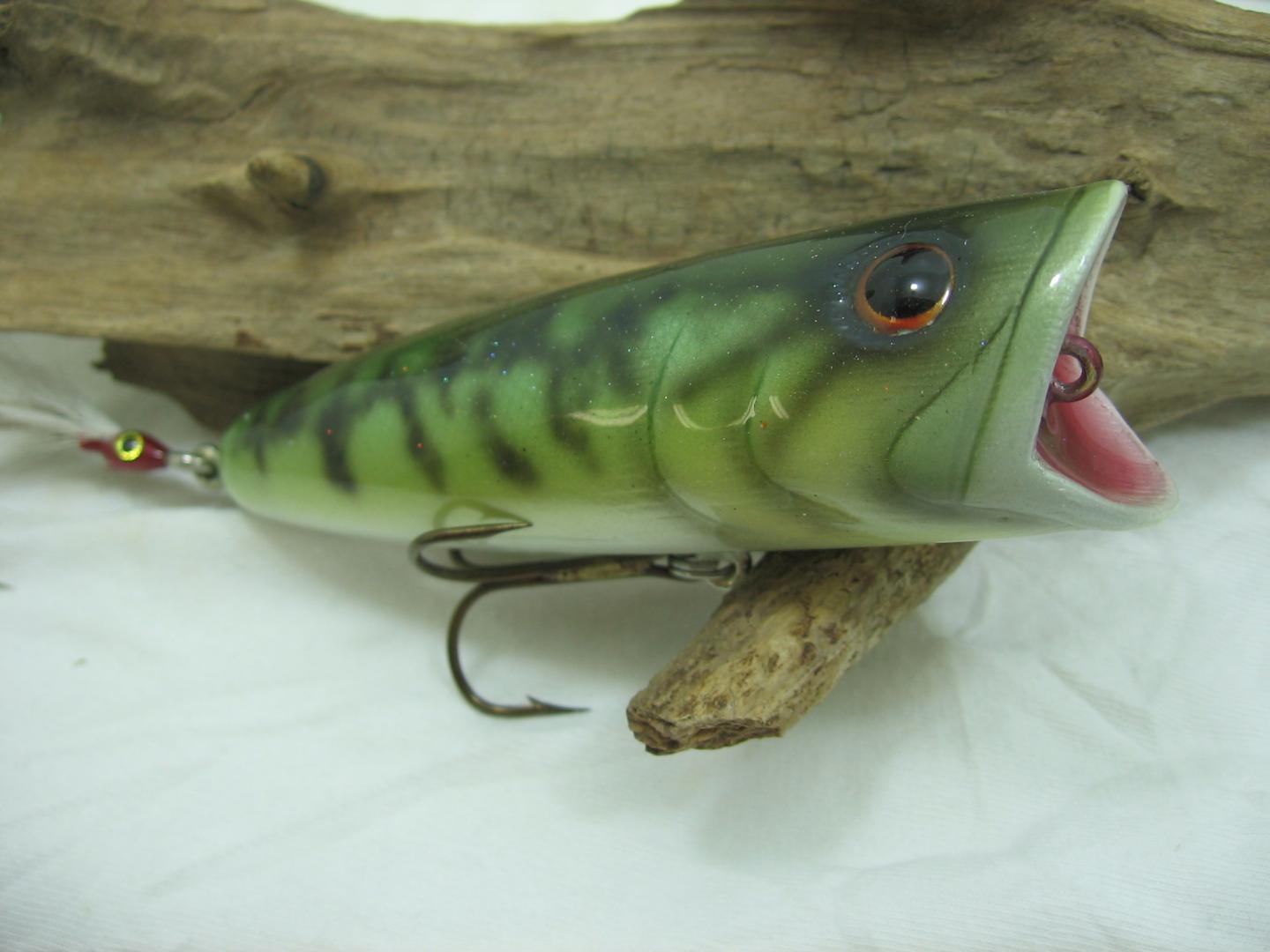 I finished the last two I was working on, and started two more for a fund raiser at my son's High School. The two completed are a realistic Crappie glide bait made from 7/8" maple, 5 1/2" long weighing 3oz. It is a slow sinking glider dropping at about 1 foot per second. I like to use these type baits when fishing parallel to a nice deep weed line, say 14'. Toss it out, count down to 5-7 feet and begin that slow tap cadence walk the dog at that weed line, just defying those ambush predators to make a move. That's a blast! The other is a much smaller popper made from WRC, 4" and 1oz, should get those large and smallmouth bass moving all season.