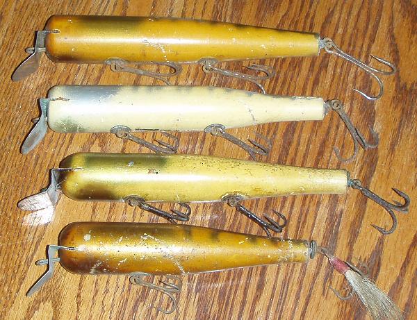 Here are some old A-40's from the late 50's w/ a couple of my repros and some early 70's A-jrs & the plastic version A54B(blk) with 2 copies of the jr & 54B. We can't forget the infamous Atom blue/white popper.I think everyone I know had one in their bag or boat growing up.