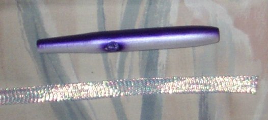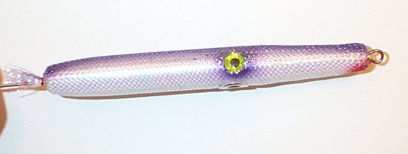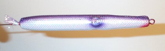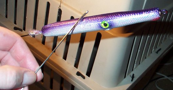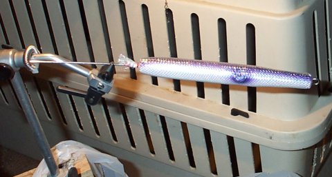 We’ll start with a needle that has already been turned, hook and eye holes drilled, primed, and painted. I’ve already added weight in the belly and have a hole drilled in the tail for a tail weight too. On this example, the tail hole is 5/16 inch and I’ll use a ¼ inch diameter slug. Note that only a very basic paint scheme is needed. In this example, I’ve done one with silver pearl belly and a pearl purple back/eyes. Also, note that the diameter of the needle right now is 0.73 inches and I have drilled out a slightly larger than usual hole for the nose grommet. The reasons for this will become clear shortly. The “hypnotic” part of the needle comes from a section of flex cord (available at many fly tying shops) that is wrapped around the needle. Here, I’m using a 3/8 inch diameter piece that is pearl color. Note that this diameter is less than that of the needle. This stuff stretches pretty well. The 3/8 inch can be forced over a plug with a diameter of 0.8 inches. Do them a little less than this to make it easier on yourself. The stuff I found at the local fly shop had a black thread down each side. A couple of careful snips with the scissors, a little pulling on the thread, and it was removed.