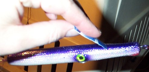 At this point, I hit the back of the plug with a quick shot of paint. Use the same color as you did under the flex cord. In this case, I used pearl purple. You only need to shoot a thin line down the back. I also add a shot of red under the chin. Once this is dry, add the eyes to the plug. You’ll need to epoxy these in place and hold tight while the epoxy sets. The 5 minute Devcon works well for this. Once the eyes have set, take a pair of scissors or a sharp knife and carefully cut the flex cord from around the front hook hole. Apply a little epoxy, then insert the grommet.