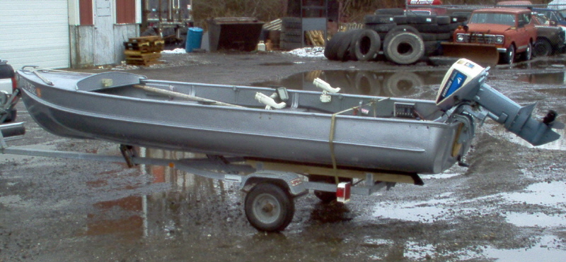 This is a nice little set up for striper fishing that I must sell. It is a 1955 Alumacraft 14ft semi-v aluminum boat that I restored completely in the fall of 2002. The motor is a 1986 Evinrude 9.9 with a 15hp powerhead that was built by PK Marine also in 2002. The trailer is a Long 2001 leftover. It has new battery, lights, inside lights for night fishing, bilge, Hummingbird fishfinder, rod holders, baitwell plumbing, carpeting, life jackets, anchor..etc. ...I guess you get the picture. It runs perfect, is excellent on gas, and is quiet enough (if you are) to sneak right up on pogies (remember them?) and schooling fish. Very easy to trailer anywhere. The price is $1800. Any questions contact game over