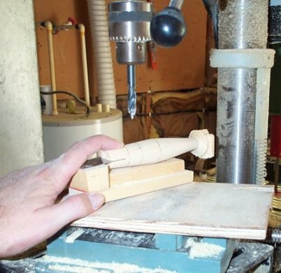 Next, I do the swivel, weight, and eye-holes. I do this on the drill press using a simple jig to keep things lined up. The jig consists of a scrap piece of sheet metal attached to a section of 2x4. The 2 by is attached to another piece of scrap wood. The sheet metal slides into the lip slot on the blank. When placed on the drill press, the blank will be held straight. Drill a 5/16 inch hole, ¼ inch deep for the weight. Drill the hole for the swivel next. I like the eyes just above the center line, so that is how I’ll mark, then drill the holes (3/8 in this case). I use forstner bits for the weight, swivel, and eye holes (yes, that is a brad point bit in the photo, I cheated for the photo  ).