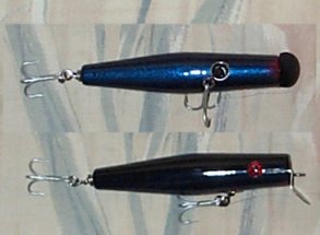 A couple of notes. I use my stuff in freshwater. For saltwater, additional weight or larger hooks may also be used. Also, I like my plugs with a front treble and a treble on the tail. The plug could also be made with an additional treble on the body or a siwash on the tail. You may have to mess with the weight a little if you go this route. When slow waked on top, the plug will have a nice wiggle with some roll. If you want less roll, you can grind the edges of the lip some so that the sides of the lip are straight rather than rounded. The tail width can also be modified to change the action some too. Same for wood type that you use. Try several and see what works best for you. To make a larger sized version, just increase the dimensions to the size that you want. The width at the front should be the same as the width of the lip you use. The version I’ve shown is one I’ve been working on for a while and it works how I want. You can use the above as a starting point and experiment to get the action you want from your plug. Be sure to post photos of the ones you come up with. Don’t worry, I don’t mind people copying this one for their own use  Happy turning