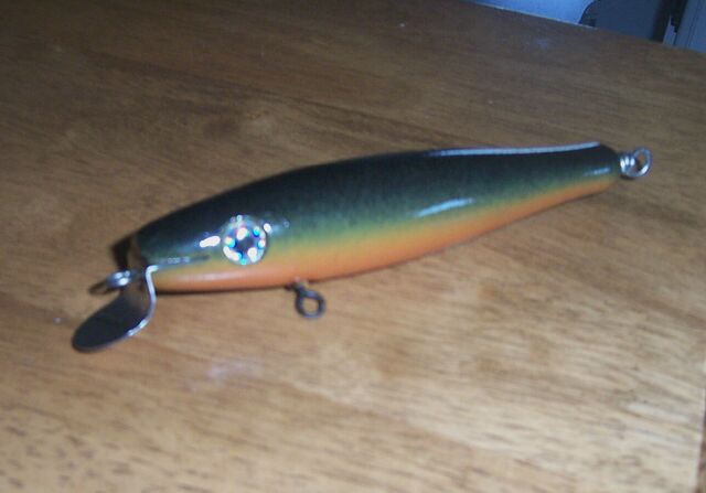 Goes a little over 4" and 2.5oz. Semi suspending lazy "S" pine minnow. NJT lefty lip works well on this casting bullet.