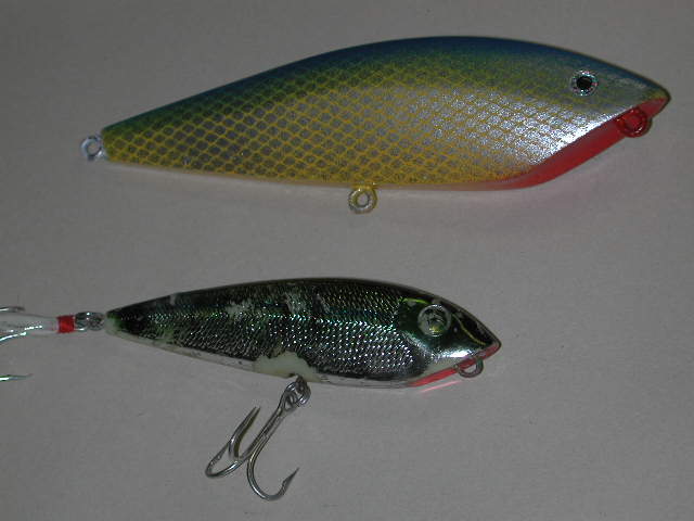 This is different. For several years now I've wondered why we don't make sinking plugs that swim like a heavy spoon or tin squid. Turns out someone else figured this out years ago. I found this plug in the bottom of a tackle box I used as a kid (35 years ago). I don't know what it is called (if you can identify it please tell us) and I always thought it was a popper that doesn't pop. But it turns out it is not a popper at all, rather it is an ingenious swimmer. It's action is something like a good swimming needlefish, or littleneck popper, though it swimms better than either. Give it a tug and it will lunge to the surface, pause and it drops with a wobble, retrive steady and it sways along flashing its flanks and swinging its tail. I haven't fished it, but I suspect it should be good. I've made a bunch of copies, all bigger, out of pine and maple. They take ALOT of lead, but boy do they look good in the water. Now if i can just learn how to paint 'em.