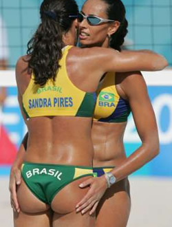 Don't know. Those beach volleyball people change playing partners often. Someone has some pictures of a few in that random image thread on SOL. One of them had BRASIL on her shorts--at least I think it was BRASIL. All I could see was BRIL, the rest of it was in the crack
