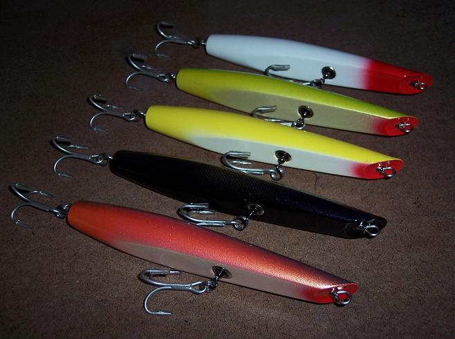 These are a very short limited run of Canal Pencils that I just finished! They are 7 inches long and weigh 3 ounces! 3/0 VMC's and triple split rings! These will not be available in shops this season....but they are available right here on S-B!  They cast a mile and are a striper slayer! They sink, they do not float! I took these down the canal last week (I have never caught a "Canal Keeper" before....many of you know the Canal and I do not get along!) I probably caught at least 10 keepers between 15 and 26 pounds......lost a "Bunker" pencil to an absolute "SLOB"! It slurped the pencil down and ran like a freight train.....I never had a chance! So look for the 40 pounder+ with a "BigFish Bunker Canal Pencil" in its maw! These are priced at $23.00 each plus $4.00 shipping! Colors are as follows!