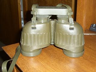 These are the Steiner 7 x 50 Military/Marine binoculars, covered in olive drab-colored rubber armor, excellent optics in both low and bright light, built-in lens and eyepiece covers, in great condition. $200 shipped.
