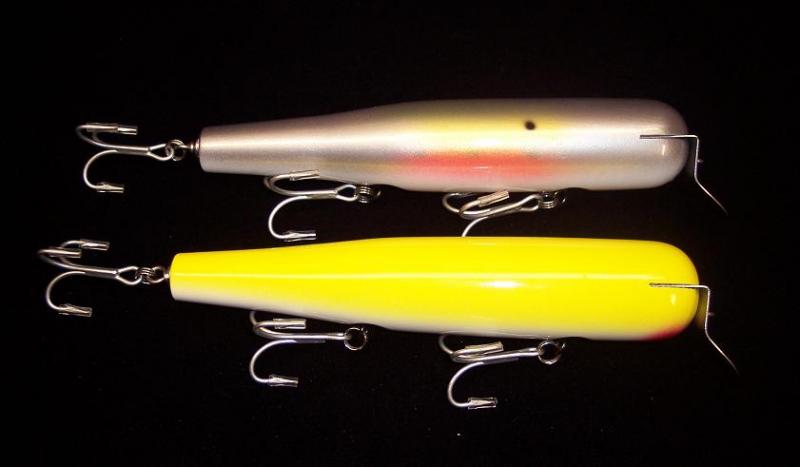 I made these poppers for the canal. The jointed herring is 6.5 inches long and weighs 3 oz. The bunker is 5 3/4 inches long and weighs 3 oz.