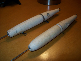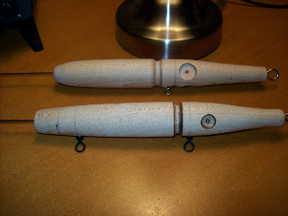looks like jan will be needlefish plug month  working on some skin meedles 6 inch,maple,both have bellyweights under the eye and 2 .20oz tailweights...the one with two bellyhooks one weight is behind the rear swevel and one(.2)is in frount of the swevel...2oz each
