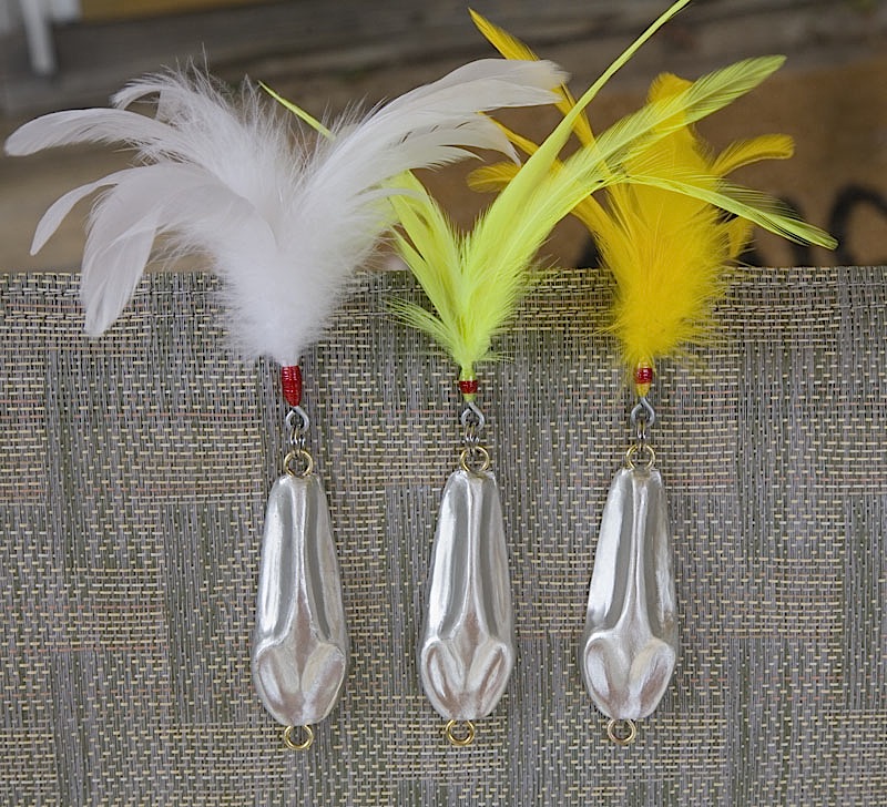 A friend of mine did an On The Water article last fall about the old-timers who made their own tins and it got me thinking about making a few of my own from scratch. I used RTV mold putty for my first attempt and it came out OK, though the putty sets up fast and is a real pain to deal with. 3.5 ounces, swims nice. (that's the one with the clay model in the pic) The third mold I did was made with pourable RTV, which I like a lot better. 2.5 ounces, casts great, beautiful action. I really like this one. (the three tins hanging from the chair) Both are pure tin. I hear there are some bunker around, so I've gotta try them out in the next few days.