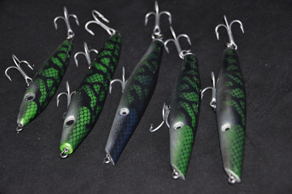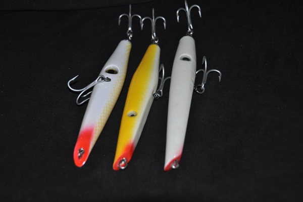 All the lures including the large spook are 3 oz or better and the small spook is 1.6 oz and should be sub surface. Sorry guys, all of the plugs are spoken for, maybe I'll set some aside on the next batch.....