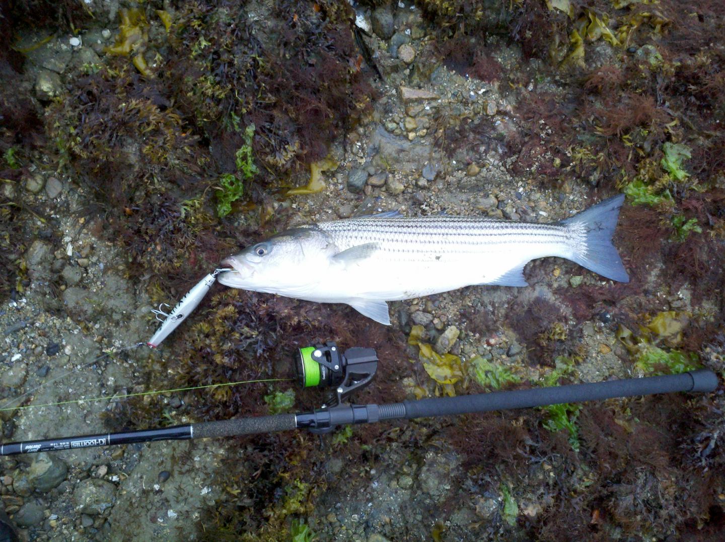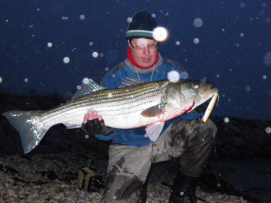Here's a conrad fish, nothing special (maybe #15), but illustrative that you need to cover the water column top to bottom when you fish. Tough night, very calm and little sweep, nothing showing. Worked the jetty spot thoroughly with dannys (surface), darters (midwater) first without a touch. I was pretty sure it was empty, but felt compelled to try dredging the bottom. Drove a conrad down, worked along real slow, made about 10 cranks and pow. Telling that this fish must have watched the other plugs pass over it 30 times without interest, but when I put a conrad in front of its face...... bingo.