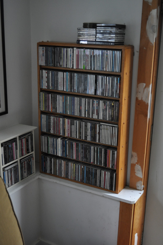 CD rack is solid oak. Made it myself many moons ago. We also have two smaller white (Pottery Barn style) CD storage cases that will probably go.