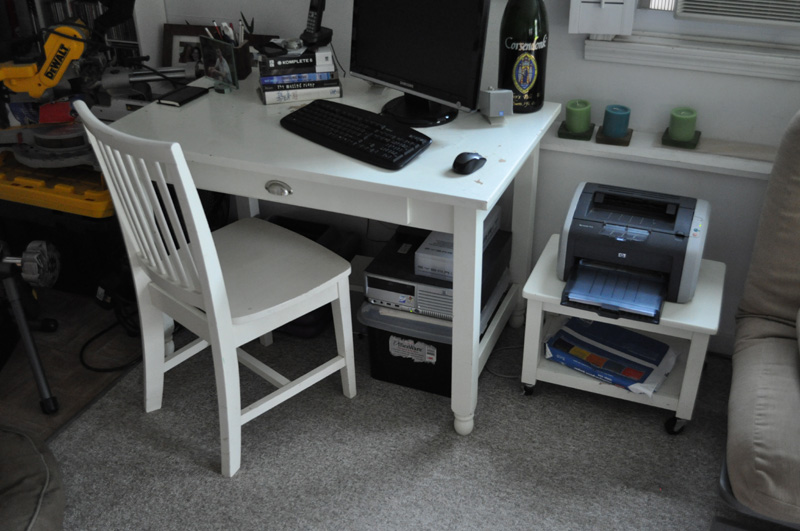 The table/chair/printer stand are from Pottery Barn Kids I believe. The top of the table is crazed and chipped but certainly workable. Great for a kids desk or a sun room.