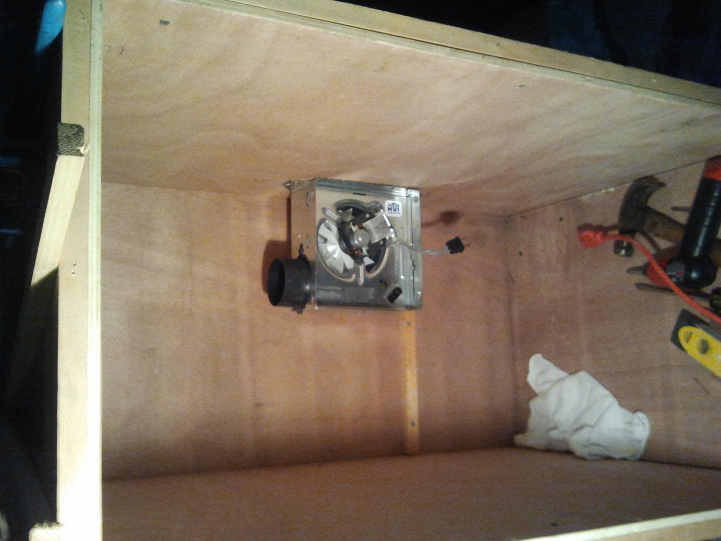 Well, here it is. I'm sure it's not much to some people, but it was by far the most technical thing I've done thus far. It has 2- 50 cf/m bathroom vent fans. The vent off the fan was 3", so I used 3" 90deg duct brackets to a 3" T, then fed that into a 4" flex duct. I couldn't seem to find any 3" flex duct, so I used a zip tie to snug it down. A few screw in hooks and a hanging wire should give me options depending on the size of plug I'm spraying. Used a 17"x25" febreeze furnace filter.
