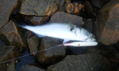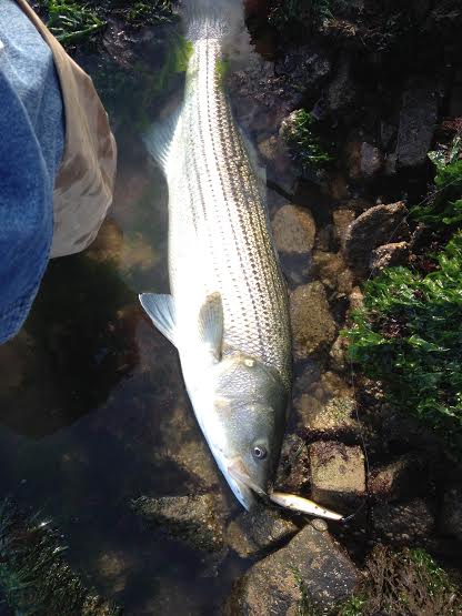 Still catching blues and bass with my Dad's needles. Green ones worked a few weeks ago and white ones this week. Here is a 24 inch blue on a 9 inch white needle. Hungry blue hitting lure almost half its size.