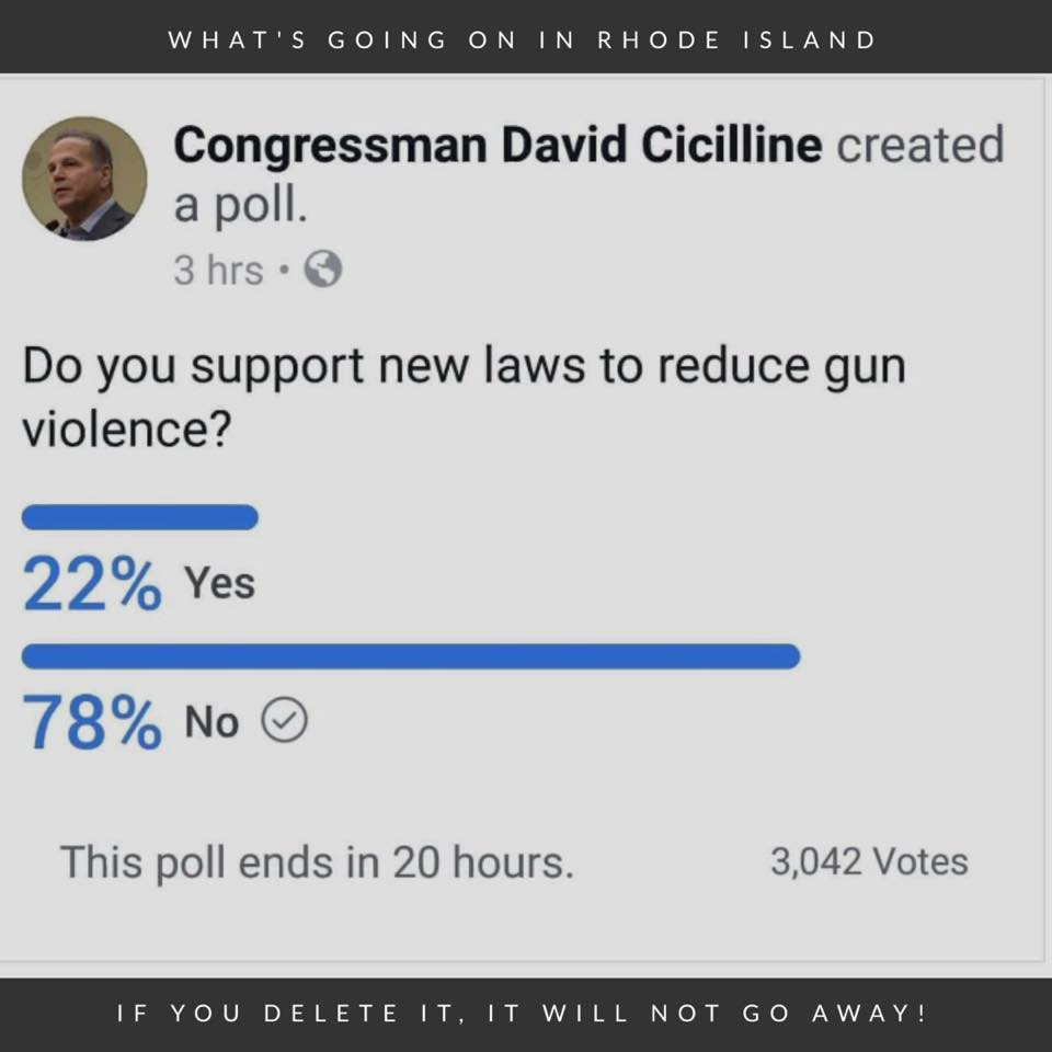 Cicciline ran a poll asking his constituents if they wanted more gun legislation to reduce gun violence.....the poll ran 76% NO to 24% YES until Cicciline had it taken down early because he didn't get the results he was hoping for....then he introduced the legislation anyway....