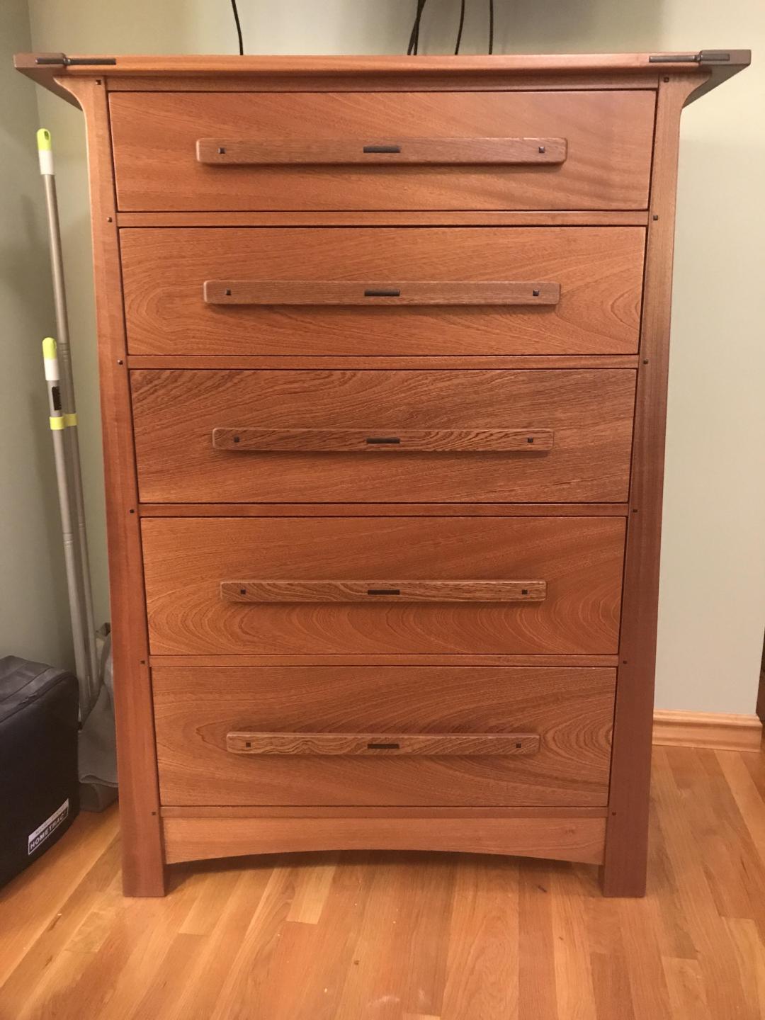 As a self employed cabinetmaker with lots of other interests and obligations I had procrastinated for 25 years building a bedroom set for my wife Melissa. This past winter I finally got to it and it was enjoyable having the time to take my time with no deadline. Even though there was a slight interruption(due to work) of getting the handles completed, it was all worth it in the end as she is very pleased. We like shaker style but I wanted something a bit more pleasing and more character so a few years ago my friend Sean told me look at Greene and Greene, I found a book and researched and then found sources for special tools and I came up with modified plans similar to some pieces by Darrell Peart. There is way more that goes in to furniture design than you would think, the Greene and Greene actually follows this formula for proportions and is a bit complicated. I had to determine all dimensions from photos as I had no plans. I chose Sapele Mahogany with Ebony accents. His website is quite elaborate.
